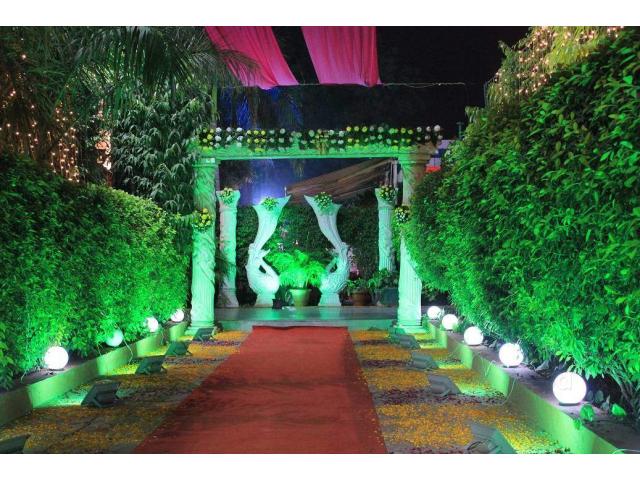 Set amidst lush green sprawling lawns promising luxury fit for any royal and located just 8 km from the international airport and 9 km from the domestic airport. It spreads over one acre and full of luxurious exterior design to the beautiful & elegant interiors which also has an air conditioned hall that spread over 2200 sq ft.. Green party lawns spread over 10000 sq. ft. and spectacular mashal lights right at the eye catching level. Last but not the least, is our beautifully designed washrooms. The Gokul Garden is ideal not only for marriage parties but also birthday parties, kitty parties, engagement parties, wedding ceremonies parties and business meetings.