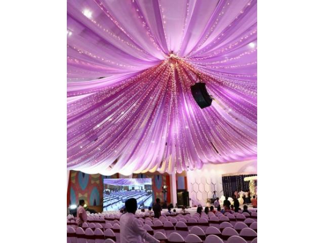 It is approximately 2000 Square Meters and is like a five-star hotel property. The Convention Centre is designed to International Standards - the stage, food arena, hand wash area, and restrooms are neatly segregated to make it a clutter-free experience. A Fully automatic dishwasher does the messy cleaning up of utensils and cutlery at a time for 2000 people. The Stage is enormous and has the trappings to handle a hanging "Mandap" up to 1000kgs and adjacent to a double bedroom unit for both bride and groom to change, shower, or extend their repertoire with a backdrop and seating arrangement for pre-wedding photography. The acoustics inside the central hall is matchless, and the single piece imported carpet adds to the aura of the venue.